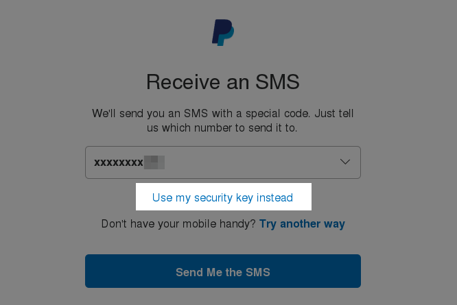 Then head over to PayPal, go to your Profile (click on the gear icon near the top right), and then on the Security tab. Click on Security Key, and then "Get Security Key". It will prompt you for your phone number; don't enter it and instead click on Cancel: